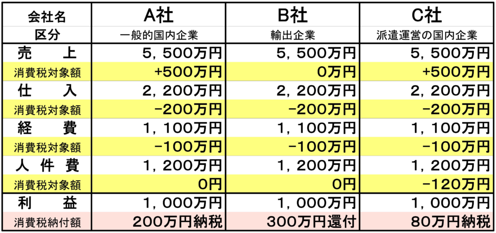ここで言うA社とは、一般的な国内企業で、商店とか、飲食店です。B社とは典型的な輸出企業で、販売先は全て海外です。C社とは、一般的な国内企業ですが、正社員は一人も雇っていなく、全て派遣会社からの派遣社員で運営している企業です。